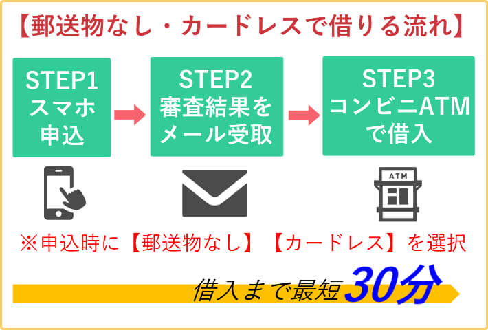 WEB完結でカードレス&郵便物なしで申し込みが出来るため家族や職場にバレたくない人にはピッタリです。スマホ申込なら、5分でWEB審査申込完了!最短30分で審査結果がその場で分かるので便利です。